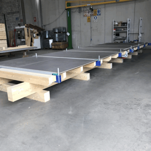 Banco montaggio pareti Timber Frame a moduli componibili.